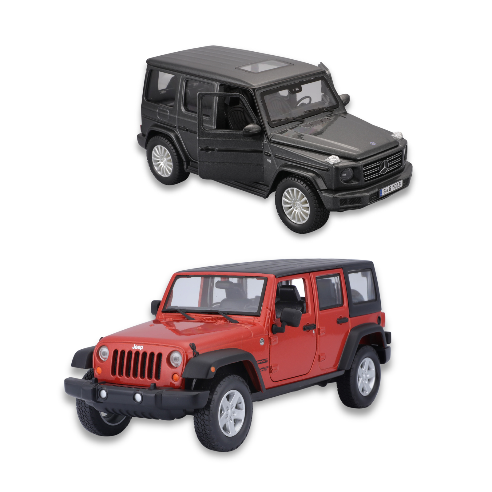 El Paquete Especial Maisto a escala 1:24 incluye dos modelos icónicos: el refinado Mercedes-Benz G-Class 2019 y el poderoso Jeep Wrangler Unlimited 2015. Fabricados en metal con componentes plásticos, cada vehículo presenta acabados de primera calidad que garantizan resistencia y durabilidad. Sus interiores detallados y pintura realista evocan la esencia de cada modelo, mientras las partes móviles permiten apreciar su diseño desde distintos ángulos.