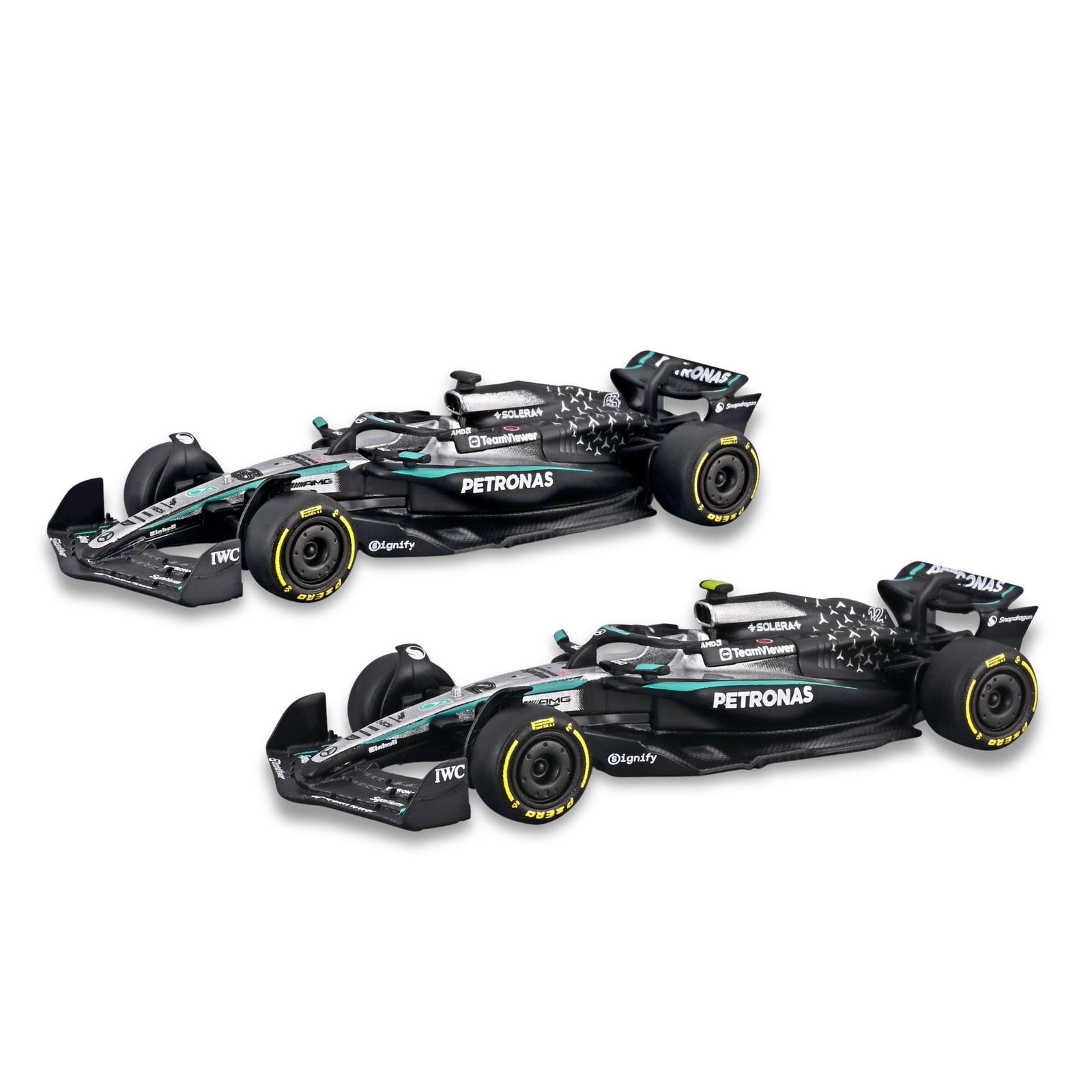 Cada modelo del set ha sido producido por Bburago, una marca líder en modelos a escala altamente reconocida por su precisión y dedicación artesanal. Desde las líneas aerodinámicas que forman la estructura del auto hasta los acabados impecables y colores distintivos, cada detalle ha sido meticulosamente replicado para brindar una experiencia auténtica y memorable. Con una fidelidad en la representación técnica y visual, este modelo captura la esencia del Mercedes-AMG W16 utilizado en competencias de Fórmula 1.